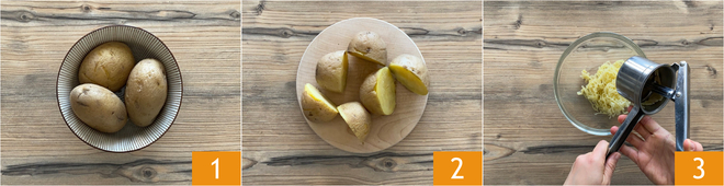 Pour préparer les petits pains de pommes de terre et gorgonzola, commencez par faire bouillir les pommes de terre dans de l'eau salée pendant 30 à 40 minutes, jusqu'à ce qu'elles soient tendres. Alternativement, vous pouvez cuire les pommes de terre à la vapeur ou au micro-ondes. Égouttez-les et laissez-les tiédir 1. Coupez-les en deux 2 et écrasez-les dans un grand bol avec un presse-purée 3. Il n'est pas nécessaire de retirer la peau avant, car elle restera à l'intérieur de l'outil.