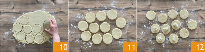 Avec un emporte-pièce de 8 cm de diamètre, découpez des disques 10. Retirez les chutes de pâte 11 et pétrissez-les à nouveau, pour créer d'autres disques. Placez sur la moitié des disques une cuillère à café de gorgonzola 12.