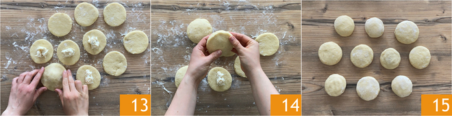 Placez un autre disque de pâte par-dessus 13 et scellez bien les bords en les pressant avec les doigts 14. Continuez ainsi jusqu'à composer 10 petits pains 15.