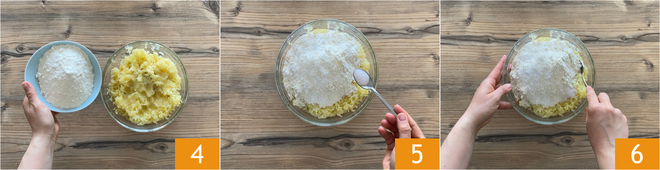 Ajoutez à la purée de pommes de terre la farine 4 et le sel 5. Mélangez les ingrédients, en essayant de les uniformiser 6.