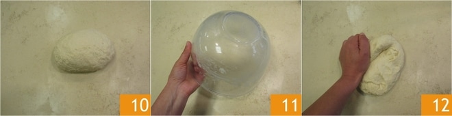 Pétrissez encore quelques minutes 10, puis couvrez avec un bol 11 et laissez reposer la pâte pendant une dizaine de minutes. Travaillez-la à nouveau 12 et boulez-la. La pâte doit être lisse et élastique.