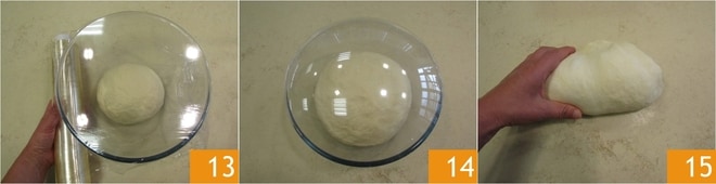 Transférez-la dans un bol, couvrez de film plastique 13 et laissez lever pendant environ 2 heures à une température de 24-26°. Une fois le temps écoulé, votre pâte aura doublé de volume 14. Transférez-la sur le plan de travail et manipulez-la brièvement pour obtenir un boudin 15.