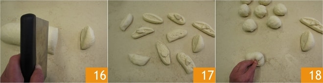 Divisez-le à l'aide d'une corne, de manière à obtenir des morceaux d'environ 90 g 16. Vous obtiendrez 10 morceaux 17. Façonnez chaque morceau en une boule 18.