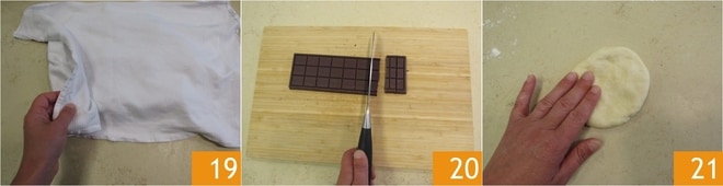 Poursuivez avec les autres, en couvrant avec un torchon humide pour éviter que la pâte ne sèche et laissez reposer pendant 10 minutes 19. Prenez les barres de chocolat et coupez-les en morceaux 20. Prenez ensuite l'une des boules et aplatissez-la avec les mains, jusqu'à obtenir un disque de 10 cm.
