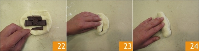 Placez le chocolat au centre, environ 30 g pour chaque 22. Couvrez avec un bord de pâte 23 et roulez-le 24.