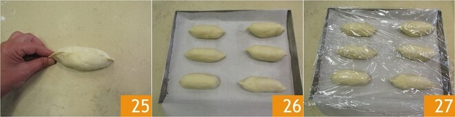 Pincez les bords pour sceller les petits pains et éviter que le chocolat ne s'échappe pendant la cuisson 25. Disposez-les au fur et à mesure sur une plaque recouverte de papier sulfurisé, en les espaçant et en plaçant la fermeture vers le bas 26. Couvrez de film plastique 27.