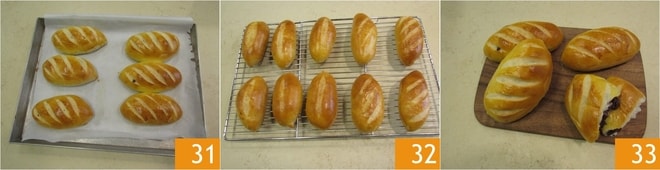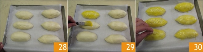 Laissez lever pendant 1 heure, ou jusqu'à ce qu'ils aient doublé de volume 28. La température recommandée est de 24-26°. Badigeonnez les petits pains avec le jaune d'œuf et la crème battus ensemble 29, puis réalisez des incisions obliques, 3 ou 4 pour chaque petit pain.