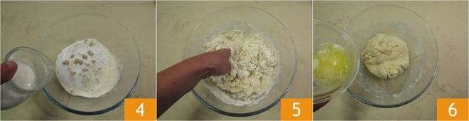 Versez le lait à température ambiante 4 et commencez à pétrir avec les mains 5. Lorsque vous aurez obtenu un mélange assez homogène, versez une partie du beurre fondu, désormais tiède, à l'intérieur 6.