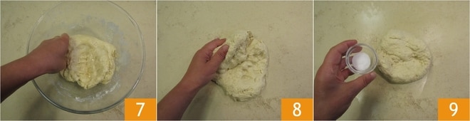 Pétrissez encore jusqu'à ce qu'il soit complètement absorbé 7 et ajoutez encore un peu de beurre. Continuez ainsi jusqu'à terminer tout le beurre, en le faisant absorber lentement. Transférez ensuite la pâte sur un plan de travail 8 et ajoutez le sel 9.