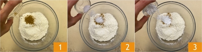 Pour réaliser les veggie buns au curry, commencez par préparer la pâte : dans un bol, versez la farine, le curry 1, le sel 2 et la levure instantanée 3.