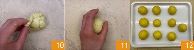 Prenez chaque morceau et formez des boules, puis ramenez les bords vers le centre 10, renversez la pâte et roulez-la pour obtenir une forme sphérique 11. Déposez les boules sur un plateau 12 et laissez reposer, couvertes d'un torchon.