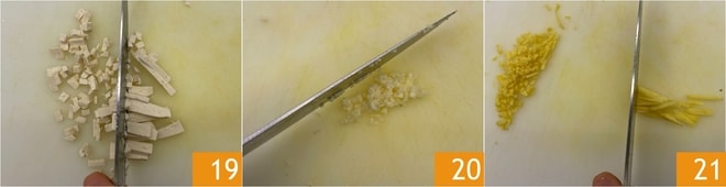 Réduisez le tofu en cubes 19. Enfin, hachez finement l'ail, dont vous aurez enlevé le germe intérieur 20, et le gingembre pelé 21.