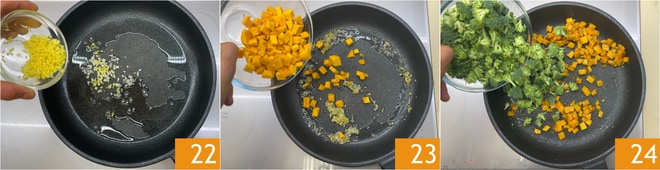 Versez l'ail et le gingembre dans une poêle avec un filet d'huile de graines 22 et laissez revenir à feu doux pendant environ 5 minutes. Ajoutez la citrouille 23 et faites revenir encore 5 minutes, puis ajoutez les brocolis 24.