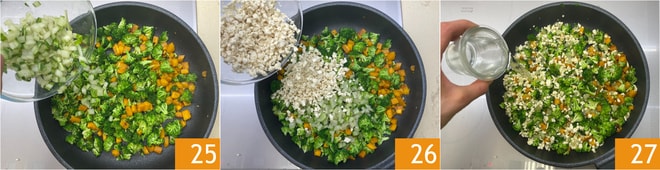 Ajoutez également les tiges des blettes 25 et le tofu 26, puis faites revenir encore 5 minutes. À ce stade, versez un peu d'eau 27, baissez le feu et cuisez environ 10 minutes.