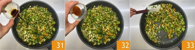 Versez la sauce soja 31 et la sauce sriracha 32, puis mélangez bien le tout 33. Réservez.