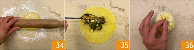 Reprenez les boules de pâte et étalez-les sur le plan légèrement fariné pour former des disques fins 34. Ajoutez au centre de chaque disque environ 60 g de farce 35, puis repliez les bords vers l'intérieur et pincez-les pour sceller les petits paquets 36. Au fur et à mesure que vous formez les petits pains, déposez-les sur un plateau à l'envers.