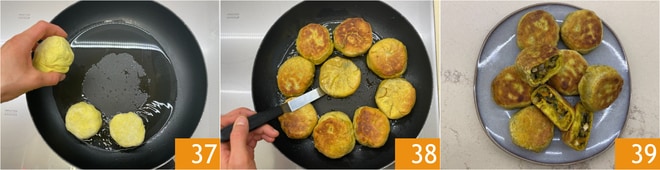 Faites chauffer l'huile de graines dans une poêle et déposez les petits pains avec la partie pincée vers le bas 37. Laissez-les dorer d'un côté, puis retournez-les de l'autre côté et continuez la cuisson à feu moyen-doux 38; cela prendra environ 15 minutes au total. Accompagnez vos veggie buns au curry de sauce soja et servez-les encore chauds 39 !