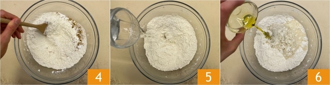 Mélangez bien 4, puis ajoutez l'eau 5 et l'huile 6.