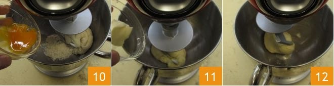 et laissez la pâte se former, puis ajoutez le jaune d'œuf à température ambiante 10. Une fois que la pâte est de nouveau bien formée, ajoutez le beurre ramolli 11. Quand le beurre est complètement absorbé et que la pâte est accrochée au crochet 12, vous pouvez transférer la pâte sur un plan de travail.