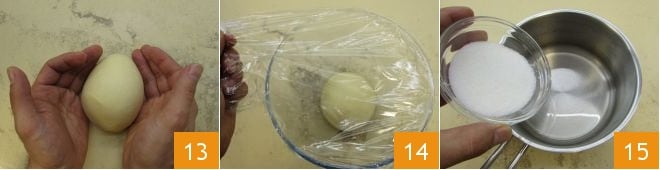 Travaillez-la avec les mains quelques instants, puis donnez une forme ronde 13 et placez-la dans un bol; couvrez de film plastique 14 et laissez lever pendant environ 6 heures dans un four éteint avec la lumière allumée (à une température d'environ 26°). Pendant ce temps, préparez le romarin caramélisé : dans une petite casserole versez l'eau et le sucre 15;