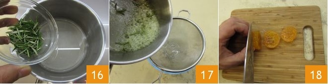 Quand le mélange frôle l'ébullition, versez les aiguilles de romarin et continuez à cuire environ 5 minutes, puis égouttez les aiguilles du sirop en filtrant avec une passoire à mailles fines 17. Mettez de côté les aiguilles de romarin confites et préparez aussi la mandarine confite : découpez-la en tranches 18
