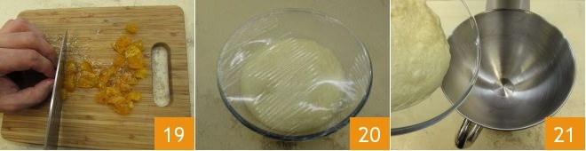 puis réduisez-la en morceaux 19 et mettez-la aussi de côté. Après les 6 heures de levée, reprenez la pâte qui aura doublé de volume 20. Versez la pâte levée dans le batteur sur socle équipé du crochet 21;