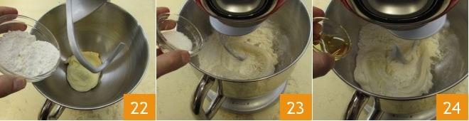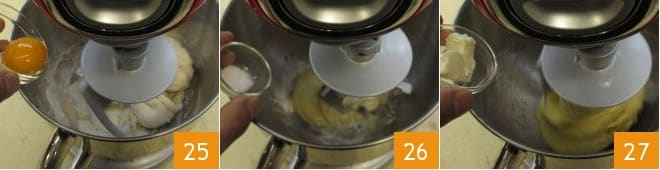 et le jaune d'œuf à température ambiante 25; laissez le batteur sur socle fonctionner jusqu'à ce que les ingrédients soient bien absorbés et que la pâte soit formée, puis ajoutez le sel 26, puis le beurre ramolli 27.