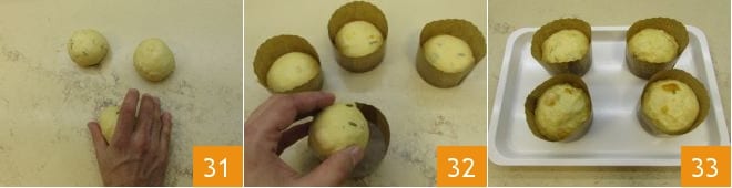 Travaillez sur le plan en roulant chaque morceau pour obtenir des boules 31 et placez-les dans les moules en papier pour pandorini 32. Laissez lever pendant environ 4 heures à température ambiante; ils seront prêts lorsqu'ils auront atteint les 3/4 du moule 33.