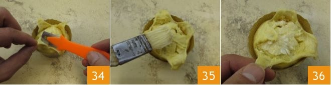 Ensuite, avec un cutter, faites une incision en croix sur le dessus de chaque pandorino et soulevez les bords 34. Badigeonnez avec le beurre fondu 35 et repliez les bords vers l'intérieur 36,