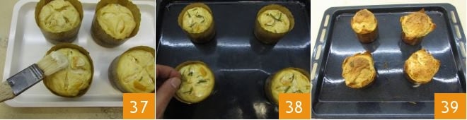badigeonnez à nouveau la surface des petits panettones 37. Placez-les sur une plaque à pâtisserie, ajoutez aussi quelques aiguilles de romarin mises de côté 38 et faites-les cuire dans un four statique préchauffé à 180° pendant environ 30 minutes (nous ne recommandons pas d'utiliser le four ventilé). Une fois prêts, sortez-les du four 39 et laissez-les tiédir avant de servir vos petits panettones avec mandarine confite et romarin!