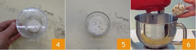quand vous avez obtenu une pâte lisse, donnez-lui une forme sphérique et placez-la dans le bol, couvert de film plastique 4. Laissez-la reposer à température ambiante pendant environ 30 minutes. Ensuite, mettez-la au réfrigérateur pour fermenter toute une nuit (entre 10 et 12 heures). Passé le temps indiqué, vous pouvez commencer le premier pétrissage : reprenez la biga 5 et transférez-la dans le batteur sur socle 6.