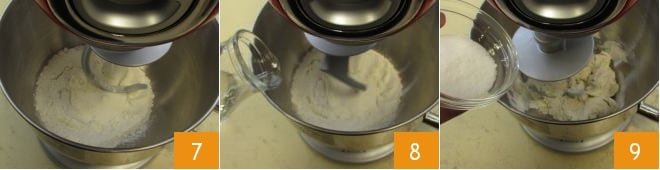Installez le crochet et versez également la farine tamisée 7, commencez à faire fonctionner le batteur sur socle et ajoutez progressivement l'eau à température ambiante 8, puis le sucre 9
