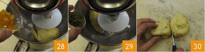 Enfin, ajoutez les mandarines confites 28 et les aiguilles de romarin confites, en en gardant quelques-unes pour la décoration finale 29. Quand elles sont incorporées à la pâte, arrêtez le batteur sur socle et transférez la pâte sur un plan de travail. Divisez la pâte totale en 4 morceaux d'environ 120 g chacun 30.