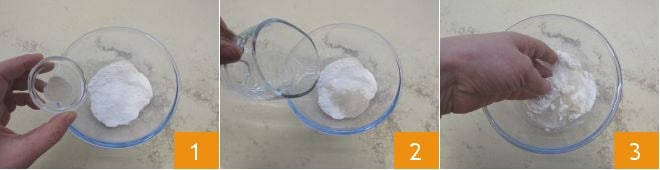 Pour préparer les petits panettones à la mandarine confite et au romarin, commencez par la biga : dans un petit bol, versez la farine tamisée et la levure déshydratée 1, puis ajoutez l'eau à température ambiante 2 et commencez à pétrir à la main 3