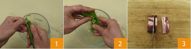 Pour préparer les petits pois mijotés avec du lard, commencez par écosser les petits pois 1 en les recueillant dans un bol, vous devriez en obtenir environ 450 g 2. Passez au lard : coupez-le d'abord en tranches 3.
