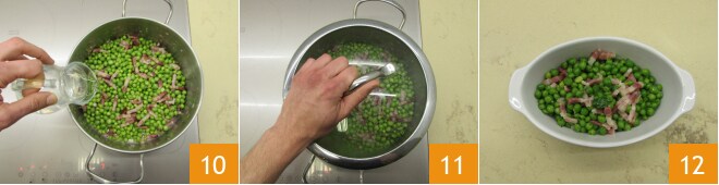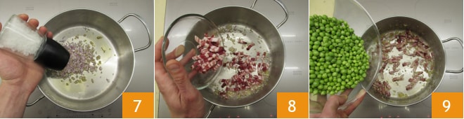 Faites cuire deux minutes à feu moyen-doux avec une pincée de sel (facultatif) 7, puis ajoutez le lard et faites cuire 3-4 minutes 8. Ajoutez les petits pois 9 et une pincée de sel.