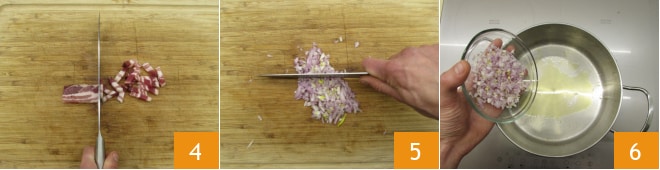 À partir de celles-ci, obtenez des lanières 4. Hachez l'échalote 5 et passez aux fourneaux. Chauffez un filet d'huile dans une casserole et ajoutez l'échalote 6.