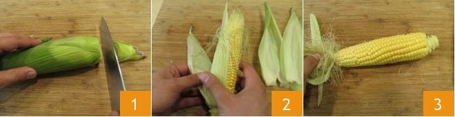 Pour réaliser l'épi de maïs en papillote, commencez par retirer la partie finale 1, puis épluchez-le en prenant soin de mettre de côté les feuilles les plus internes 2. Coupez également la barbe qui se trouve à l'intérieur 3.