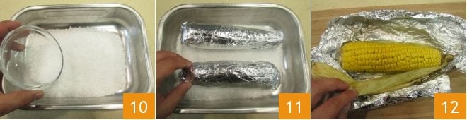 Prenez une plaque de cuisson, saupoudrez le fond avec une couche de gros sel puis déposez les épis en papillote 11 et faites cuire dans un four statique préchauffé à 180° pendant 35 minutes. Une fois cuits, sortez les épis, laissez-les tiédir avant de les servir 12.