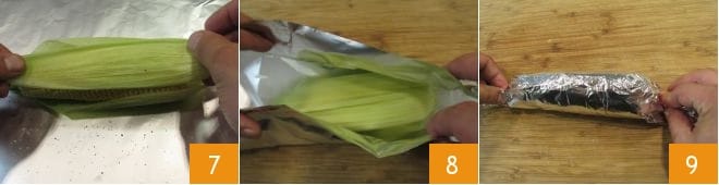 poivrez et enveloppez-le avec d'autres feuilles 7 afin de couvrir entièrement le cœur. Maintenant, enveloppez également l'épi dans le papier aluminium 8 en scellant bien les deux extrémités 9.