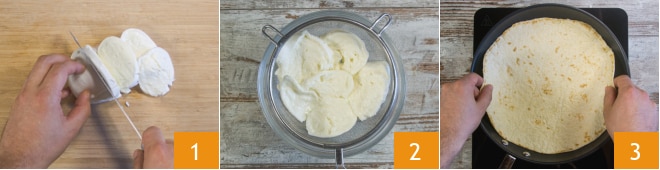 Pour préparer la piadina avec tomates séchées et mozzarella de bufflonne, commencez par couper la mozzarella en tranches 1 et laissez-la égoutter dans une passoire pendant au moins 30 minutes 2. Après ce temps, mettez une poêle sur le feu et chauffez la première piadina pendant 30 secondes d'un côté 3.