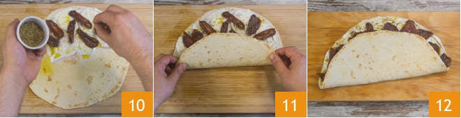 Saupoudrez d'une pincée d'origan 10 et pliez la piadina en deux 11. Procédez de la même manière pour préparer l'autre et dégustez votre piadina avec tomates séchées, bufflonne et origan 12 !