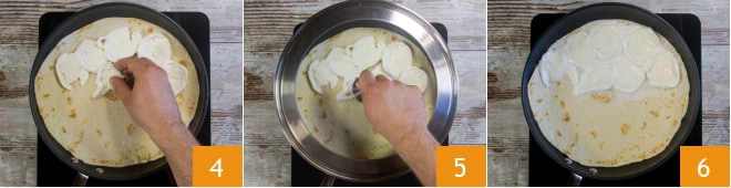 Puis chauffez également pendant 30 secondes de l'autre côté, en ajoutant la moitié des tranches de mozzarella sur un côté de la piadina 4. Couvrez avec un couvercle 5 et attendez qu'elle fonde 6.