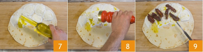 À ce stade, transférez la piadina sur une planche à découper et assaisonnez avec de l'huile 7 et du poivre 8, puis ajoutez la moitié des tomates séchées 9.