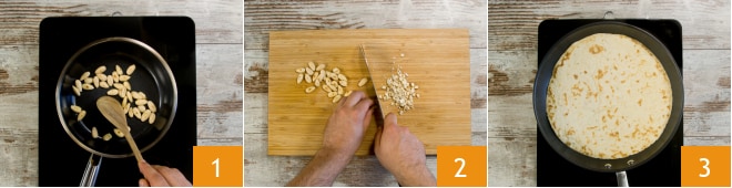Pour préparer la piadina au jambon cru et mascarpone, grillez les amandes qui seront la note croquante de la garniture. Grillez-les dans une poêle sans ajouter de matières grasses, à feu moyen-doux 1. Hachez-les avec un couteau 2. Chauffez une des deux piadines dans une poêle déjà chaude, attendez 30 secondes puis retournez-la 3, pour chauffer également de l'autre côté.