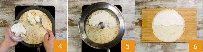 Maintenant, étalez la moitié du mascarpone sur la moitié de la piadina 4, couvrez avec un couvercle et attendez une minute de plus 5. Transférez la piadina sur une planche à découper 6,