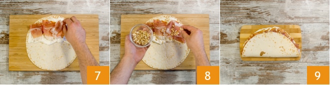 ajoutez quelques tranches de jambon cru 7 et la moitié des amandes grillées 8. Repliez en deux 9, préparez l'autre piadina de la même manière et dégustez-les encore chaudes !