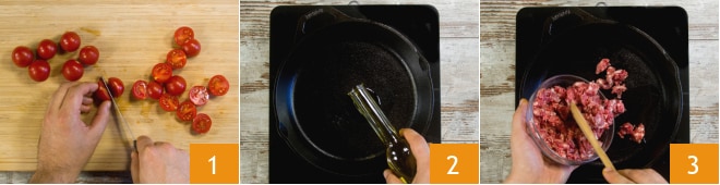 Pour préparer la piadina avec 'nduja, saucisse et tomates cerises, commencez par couper les tomates cerises en deux 1, puis retirez l'enveloppe de la saucisse et émiettez-la. Chauffez un filet d'huile dans une poêle 2 et ajoutez la saucisse émiettée 3.
