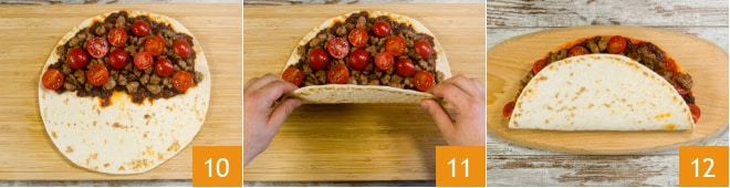 Répartissez la moitié des tomates cerises 10 et pliez la piadina en deux 11. Procédez de la même manière pour préparer la seconde et dégustez votre piadina avec 'nduja, saucisse et tomates cerises 12.