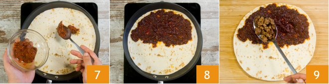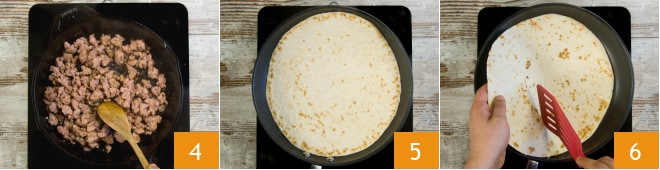 Faites revenir la saucisse en remuant avec une cuillère en bois, jusqu'à ce qu'elle change de couleur 4. Mettez la saucisse de côté et chauffez la première piadina dans une autre poêle pendant 30 secondes 5, puis retournez-la de l'autre côté 6, pour la chauffer 30 secondes de plus.